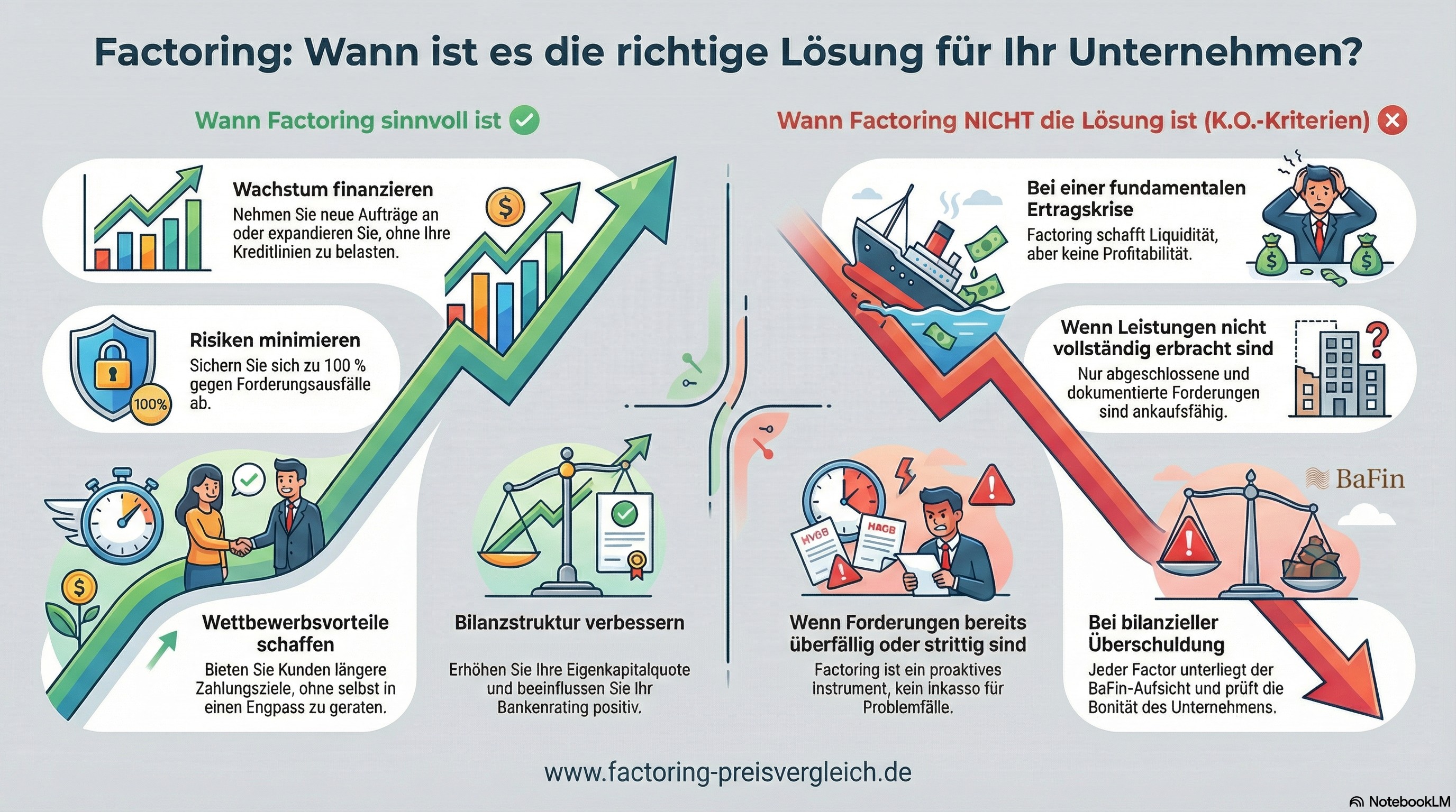 Wie auch in der Vorlage dargestellt ist Factoring ungeeignet, wenn grundlegende Probleme im Unternehmen vorliegen oder die Voraussetzungen nicht erfüllt sind.