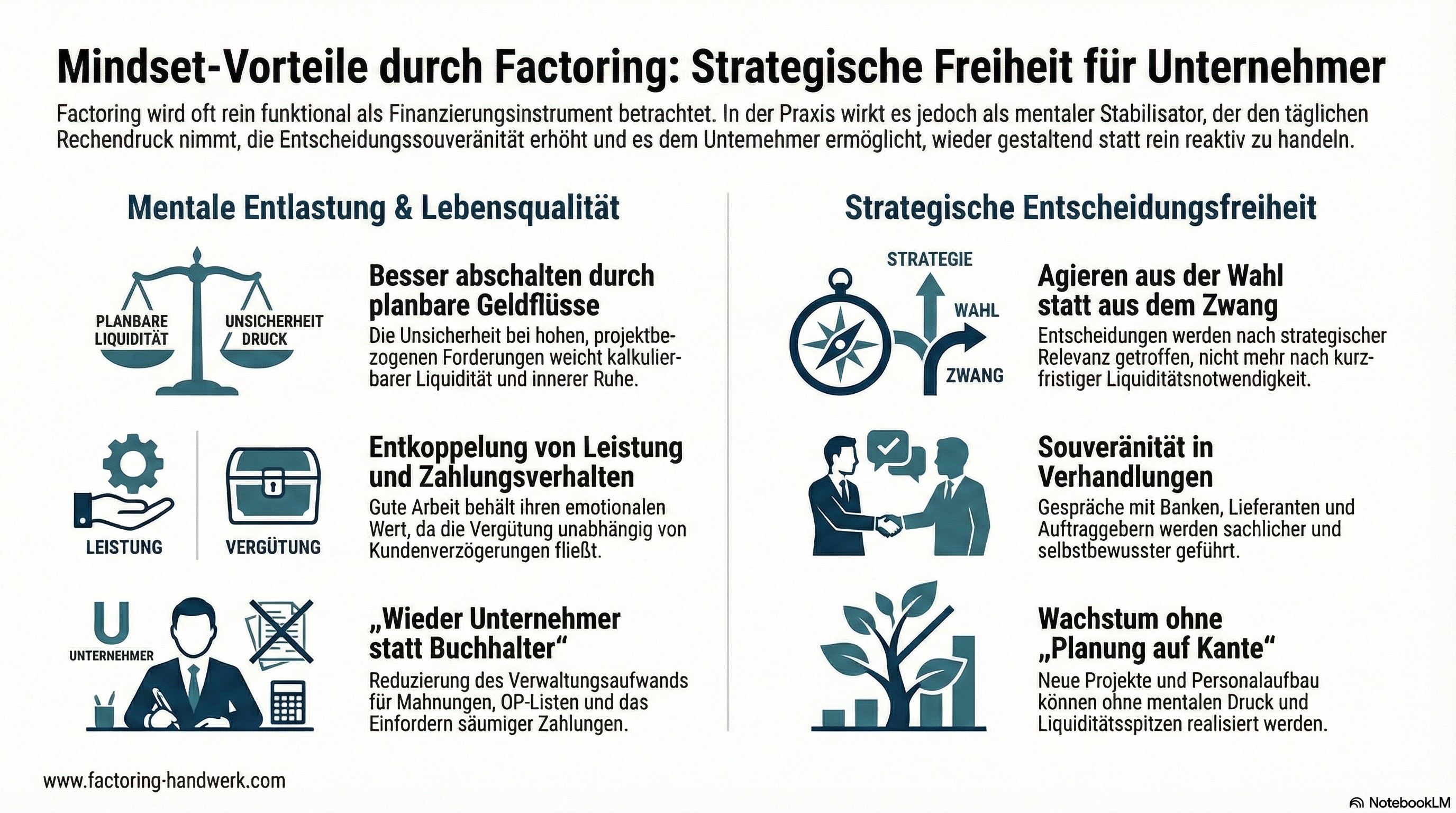 Nicht zu unterschätzen sind die psychologischen Vorteile durch die Factoring Nutzung. Sie stellen ihre Finanzplanung nicht mehr auf gut Glück auf, sondern wissen, dass das 90 % des Rechnungsbetrages in aller Regel sofort nach Rechnungsstellung erfolgt. Das verschafft Ihnen finanzielle Souveränität und reduziert die Abhängigkeit von Banken.